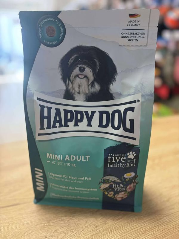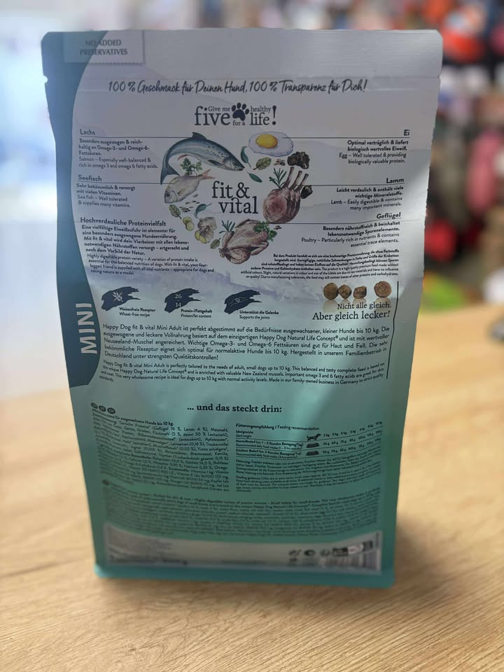 Happy Dog fit & vital Mini Adult est parfaitement adapté aux besoins des chiens adultes de petite race normalement actifs, jusqu'à 10 kg de poids. Cette alimentation complète, équilibrée et savoureuse, est basée sur le concept exclusif Happy Dog Natural Life Concept® et est enrichi de précieuses moules de Nouvelle-Zélande pour plus de plaisir à bouger. Les acides gras essentiels oméga-3 et oméga-6 contribuent à une barrière cutanée saine et favorisent un pelage brillant. La recette sans gluten, très digeste, renforce en outre le système immunitaire des chiens de petite race avec de la vitamine C et des herbes sélectionnées, pour une vie de chien longue et saine.