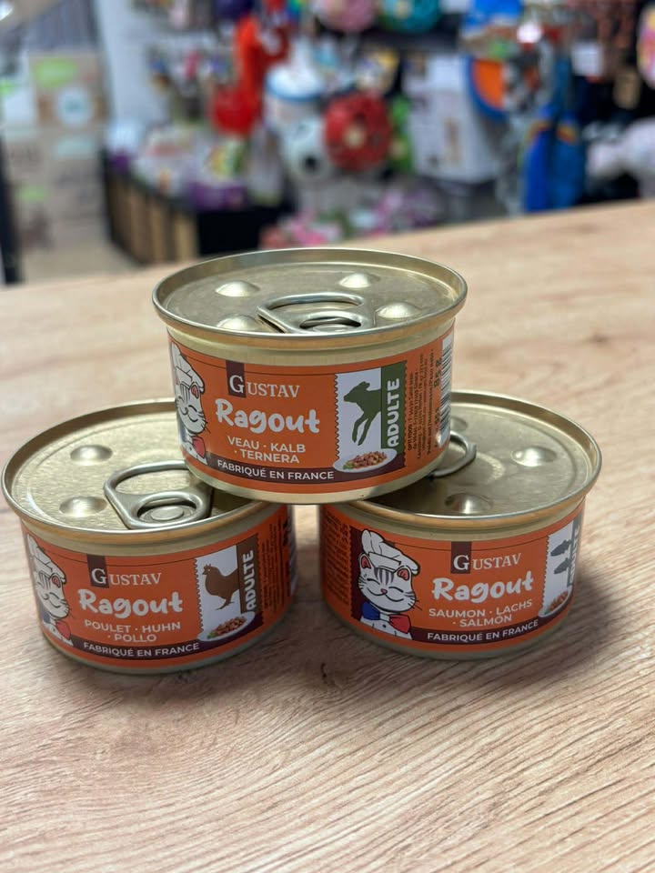 - Veau : Composition : Viandes et sous-produits animaux (dont 4% veau), sous-produits d’origines végétales, carottes séchées (équivaut à 4% réhydraté), substances minérales. Constituants analytiques : Protéine 6.5%, Matière grasse 4%, Cendres brutes 1.5%, Cellulose brute 0.3%, Humidité 84%.